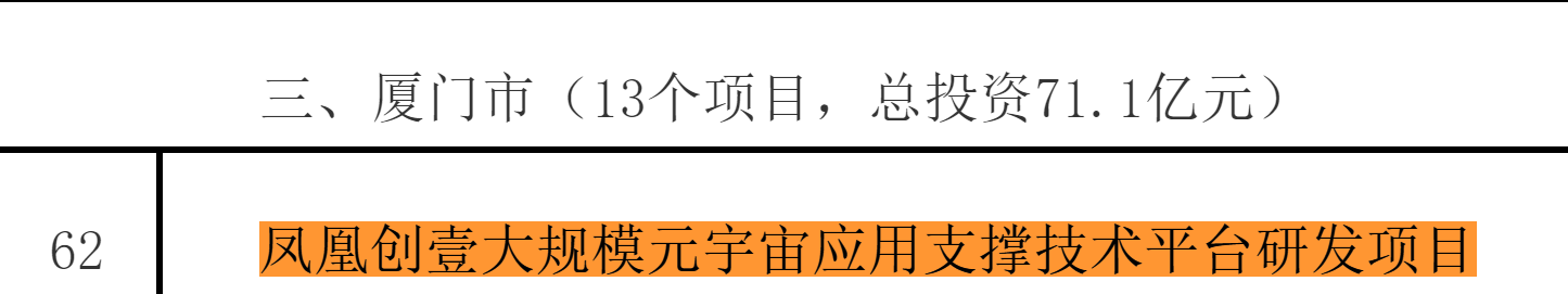 近日,根據(jù)省政府工作部署,為深入開(kāi)展習(xí)近平新時(shí)代中國(guó)特色社會(huì)主義思想主題教育,持續(xù)拓展“深學(xué)爭(zhēng)優(yōu)、敢為爭(zhēng)先、實(shí)干爭(zhēng)效”行動(dòng),更大發(fā)揮數(shù)字經(jīng)濟(jì)重點(diǎn)項(xiàng)目支撐帶動(dòng)作用,進(jìn)一步做大做強(qiáng)做優(yōu)數(shù)字經(jīng)濟(jì),經(jīng)部門(mén)地方推薦,省數(shù)字辦遴選確定2023年度省數(shù)字經(jīng)濟(jì)重點(diǎn)項(xiàng)目191個(gè),項(xiàng)目總投資1168億元,年度計(jì)劃投資260億元。這是我省首次遴選確定年度數(shù)字經(jīng)濟(jì)重點(diǎn)項(xiàng)目。廈門(mén)市有鳳凰創(chuàng)壹大規(guī)模元宇宙應(yīng)用支撐技術(shù)平臺(tái)研發(fā)項(xiàng)目等13個(gè)項(xiàng)目列入,總投資71.1億元。
