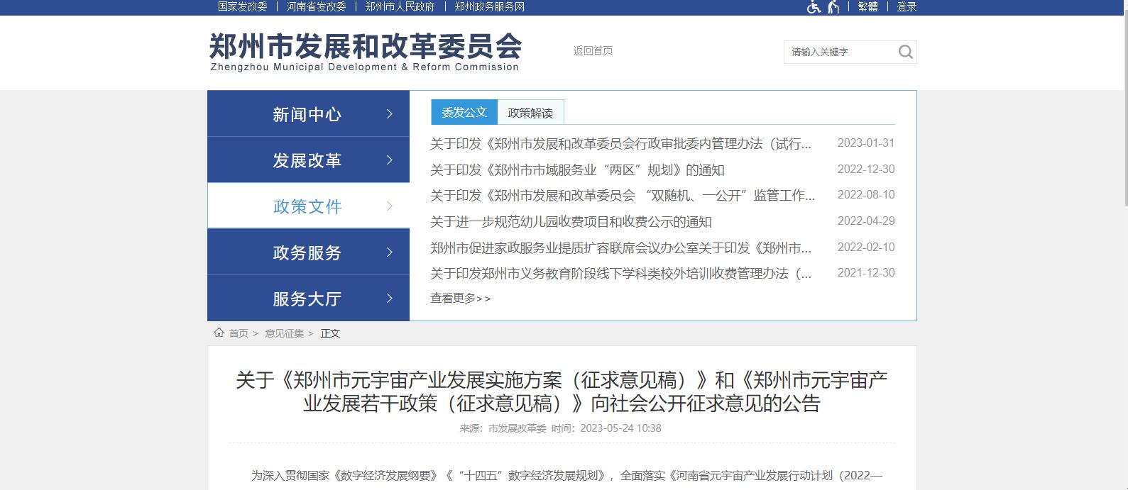 為加快構建鄭州特色元宇宙產業(yè)生態(tài)體系,搶占未來產業(yè)制高點,帶動全市數(shù)字經濟彎道超車、換道領跑,培育新的經濟增長點。5月24日,鄭州發(fā)改委網站發(fā)布《鄭州市元宇宙產業(yè)發(fā)展實施方案(征求意見稿)》(以下簡稱《方案》)和《鄭州市元宇宙產業(yè)發(fā)展若干政策(征求意見稿)》(以下簡稱《若干政策》),并向社會公開征求意見。
