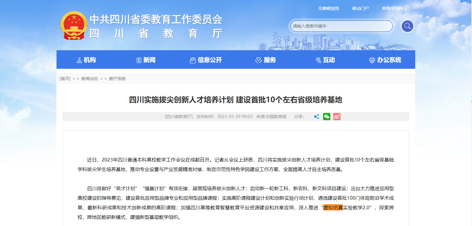 近日,2023年四川普通本科高校教學(xué)工作會議在成都召開。會上公布四川將實施拔尖創(chuàng)新人才培養(yǎng)計劃,建設(shè)首批10個左右省級基礎(chǔ)學(xué)科拔尖學(xué)生培養(yǎng)基地,推動專業(yè)設(shè)置與產(chǎn)業(yè)發(fā)展精準對接,制定示范性特色學(xué)院建設(shè)工作方案,全面提高人才自主培養(yǎng)質(zhì)量。