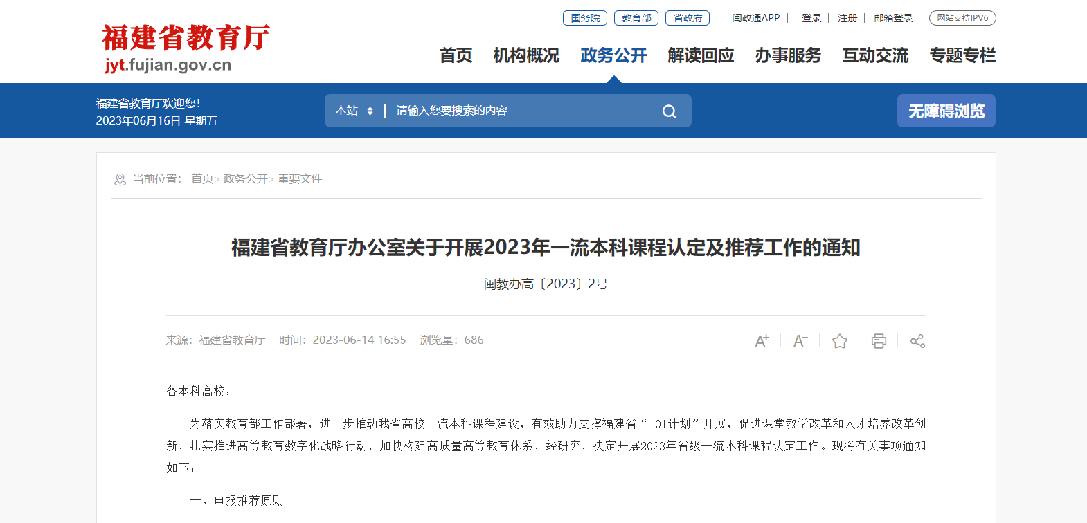 為落實(shí)教育部工作部署,進(jìn)一步推動(dòng)我省高校一流本科課程建設(shè),有效助力支撐福建省“101計(jì)劃”開(kāi)展,促進(jìn)課堂教學(xué)改革和人才培養(yǎng)改革創(chuàng)新,扎實(shí)推進(jìn)高等教育數(shù)字化戰(zhàn)略行動(dòng),加快構(gòu)建高質(zhì)量高等教育體系,經(jīng)研究,決定開(kāi)展2023年省級(jí)一流本科課程認(rèn)定工作?,F(xiàn)將有關(guān)事項(xiàng)通知如下: