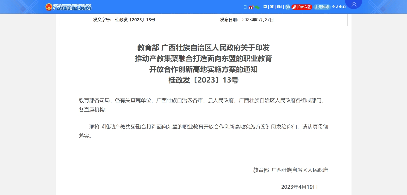 教育部 廣西壯族自治區(qū)人民政府關(guān)于印發(fā)推動產(chǎn)教集聚融合打造面向東盟的職業(yè)教育開放合作創(chuàng)新高地實施方案的通知桂政發(fā)〔2023〕13號