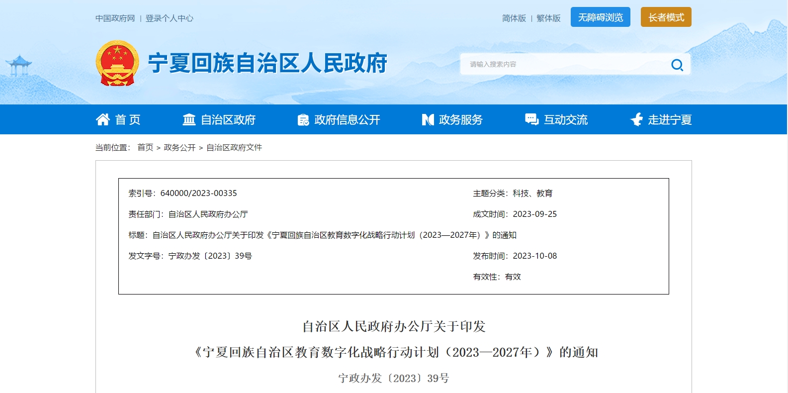 《寧夏回族自治區(qū)教育數(shù)字化戰(zhàn)略行動(dòng)計(jì)劃(2023—2027年)》已經(jīng)自治區(qū)人民政府第28次常務(wù)會議審議通過,現(xiàn)印發(fā)給你們,請認(rèn)真貫徹落實(shí)。