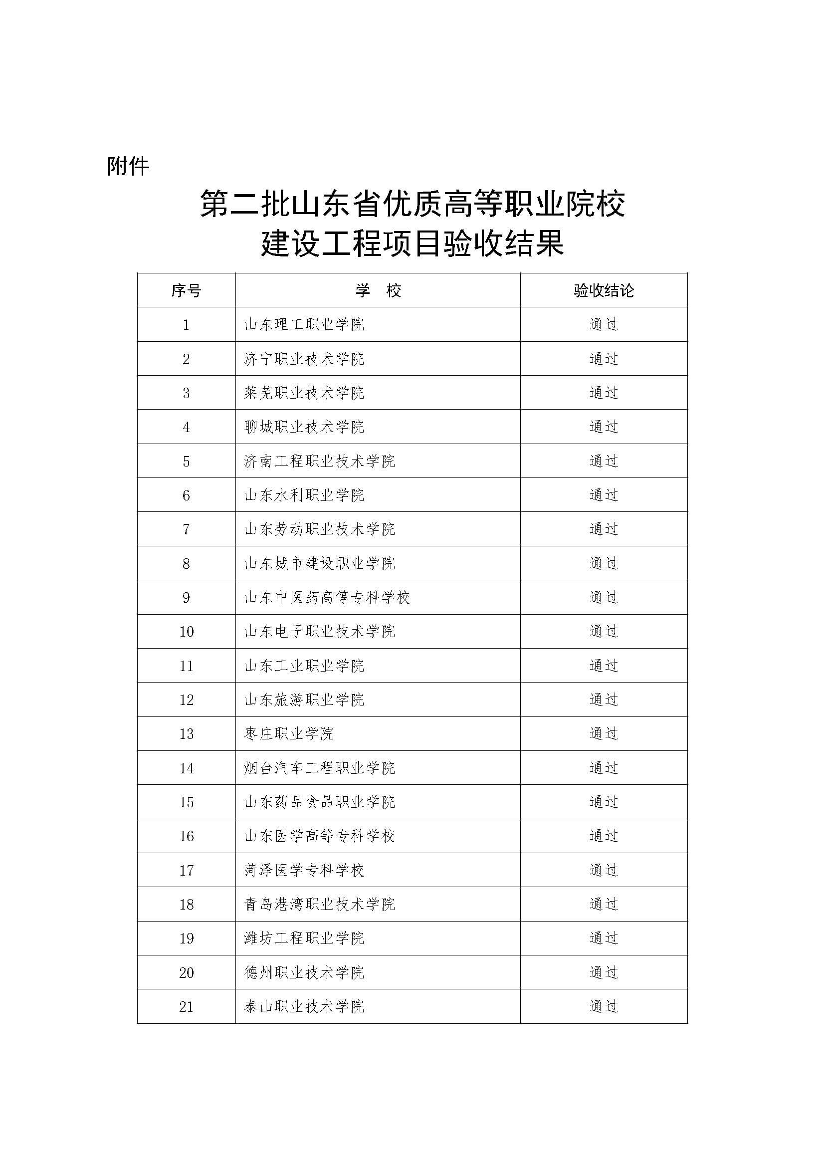 根據(jù)山東省優(yōu)質(zhì)高等職業(yè)院校建設(shè)工程實(shí)施管理規(guī)定,在學(xué)校自評(píng)、項(xiàng)目審計(jì)基礎(chǔ)上,我廳組織專家采取現(xiàn)場(chǎng)評(píng)估方式,對(duì)第二批立項(xiàng)建設(shè)的省優(yōu)質(zhì)高職院校進(jìn)行了驗(yàn)收。按照《山東省教育廳 山東省財(cái)政廳關(guān)于實(shí)施山東省優(yōu)質(zhì)高等職業(yè)院校建設(shè)工程的通知》(魯教職字〔2017〕4號(hào))相關(guān)規(guī)定,依據(jù)專家驗(yàn)收結(jié)果,21所立項(xiàng)建設(shè)的第二批省優(yōu)質(zhì)高職院校全部驗(yàn)收通過,授予“山東省優(yōu)質(zhì)高等職業(yè)院?!狈Q號(hào)。驗(yàn)收結(jié)果經(jīng)公示無異議,現(xiàn)予以公布(見附件)。