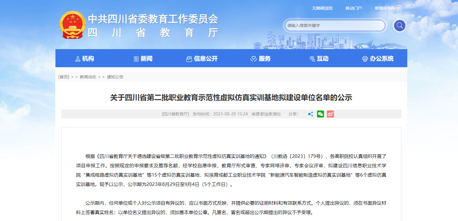 近日,四川省教育廳根據(jù)《四川省教育廳關(guān)于遴選建設(shè)省級第二批職業(yè)教育示范性虛擬仿真實(shí)訓(xùn)基地的通知》(川教函〔2023〕179號),公布了第二批職業(yè)教育示范性虛擬仿真實(shí)訓(xùn)基地?cái)M建設(shè)單位名單,擬建設(shè)四川信息......