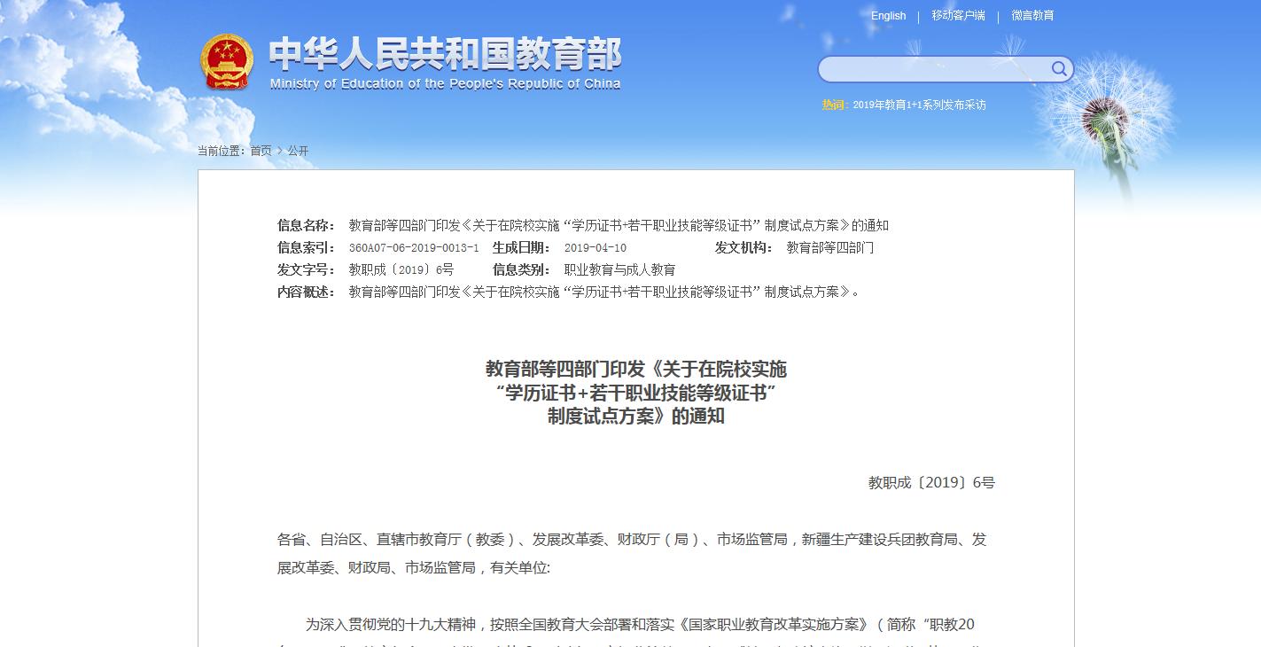 2019年,職業(yè)教育的‘一盤(pán)大棋’正在推進(jìn),改革逐步進(jìn)行。近日,教育部等四部門(mén)印發(fā)《關(guān)于在院校實(shí)施“學(xué)歷證書(shū)+若干職業(yè)技能等級(jí)證書(shū)”制度試點(diǎn)方案》的通知,對(duì)國(guó)務(wù)院印發(fā)的《國(guó)家職業(yè)教育改革實(shí)施方案》中提......