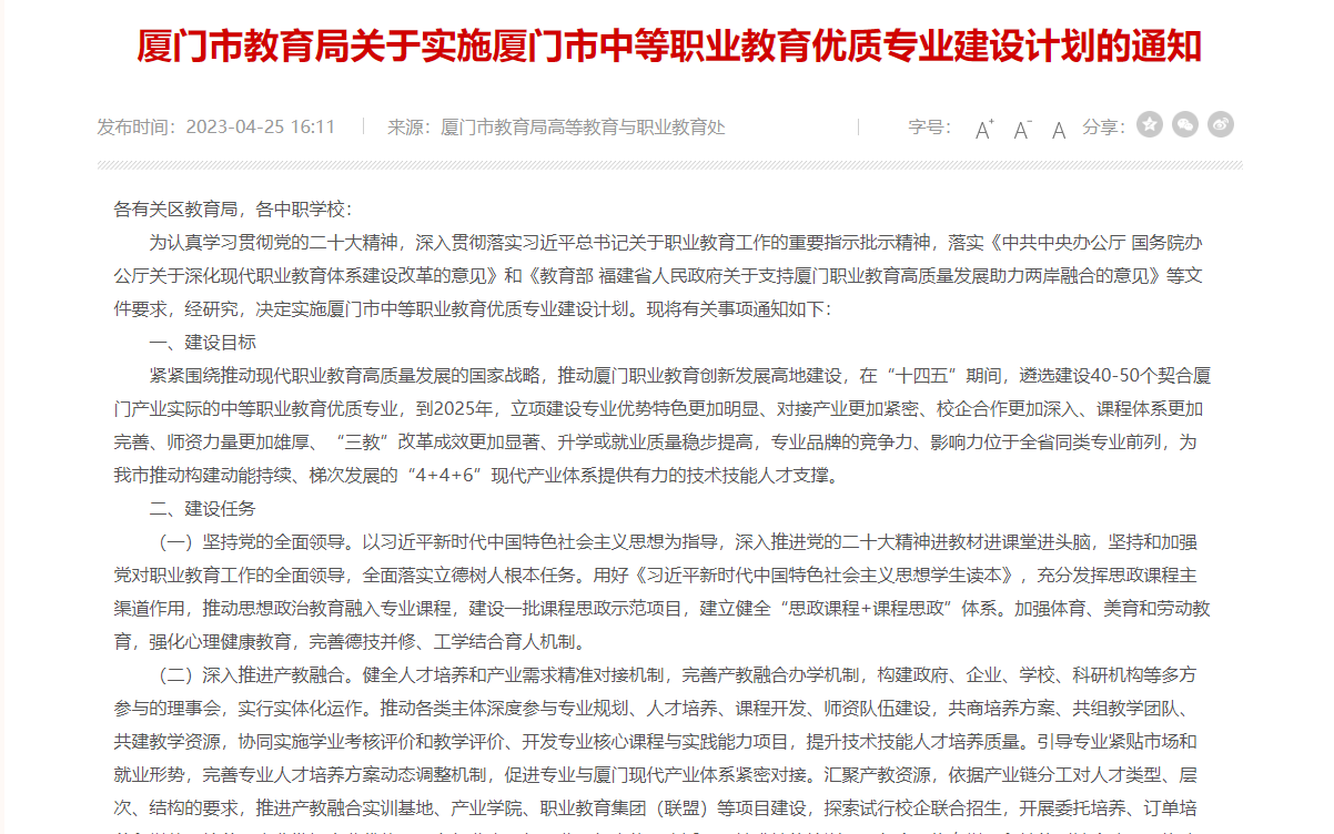廈門市教育局發(fā)布關(guān)于實施廈門市中等職業(yè)教育優(yōu)質(zhì)專業(yè)建設(shè)計劃的通知
