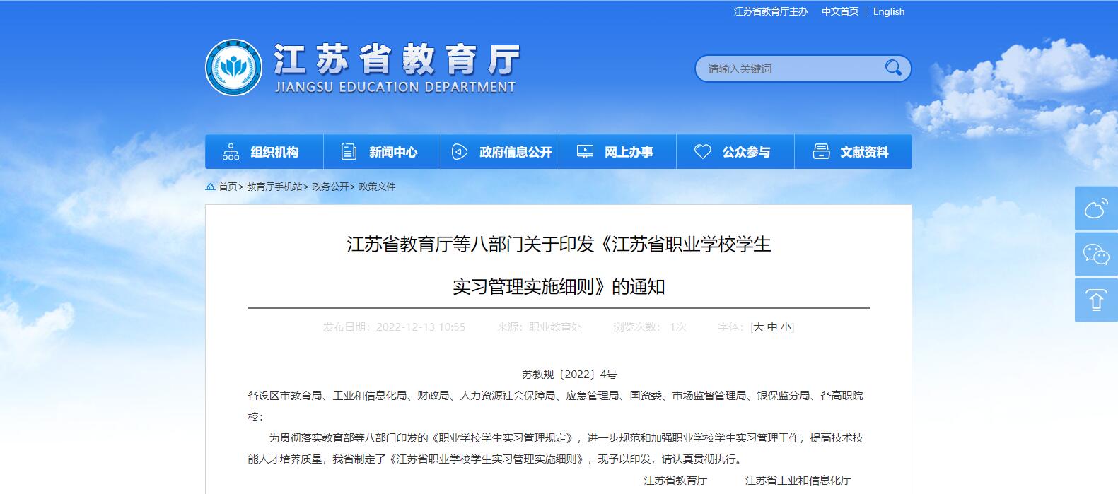 江蘇省教育廳等八部門日前聯(lián)合印發(fā)《江蘇省職業(yè)學校學生實習管理實施細則》