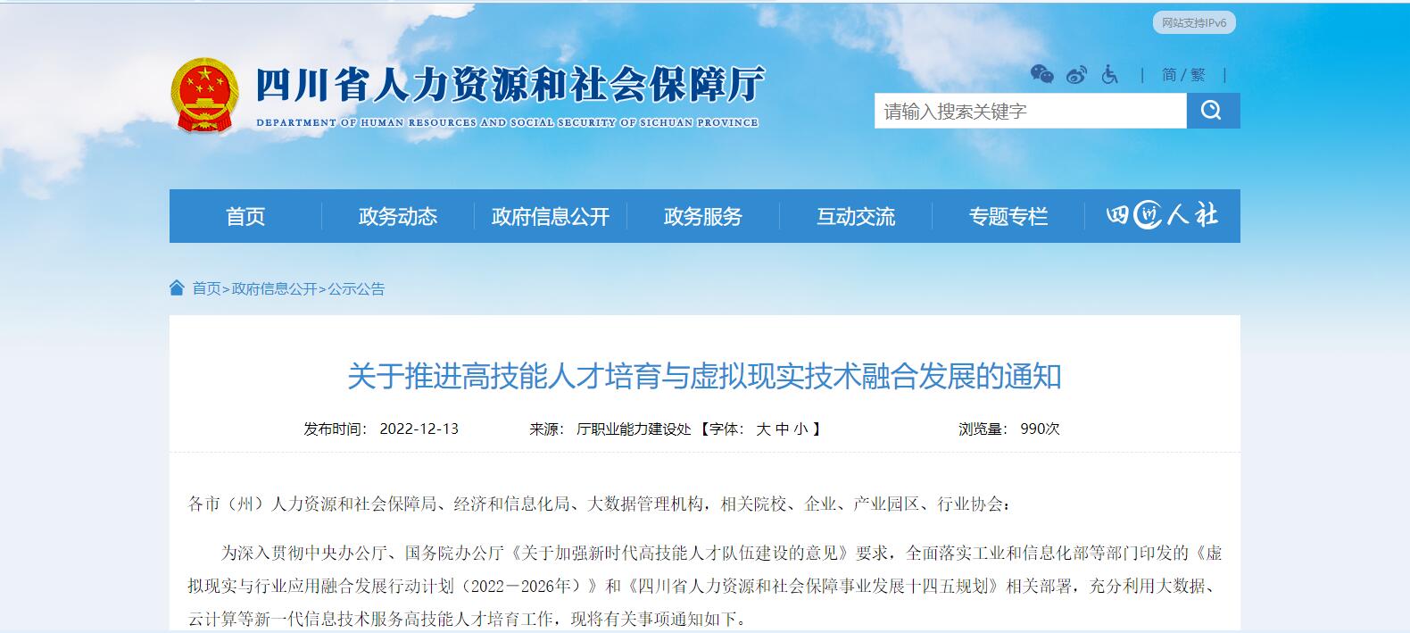四川省人社廳等3部門聯(lián)合印發(fā)《關于推進高技能人才培育與虛擬現(xiàn)實技術融合發(fā)展的通知》
