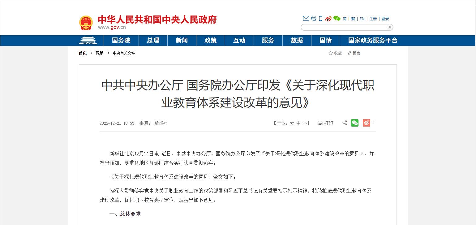 國務院印發(fā)《關于深化現(xiàn)代職業(yè)教育體系建設改革的意見》