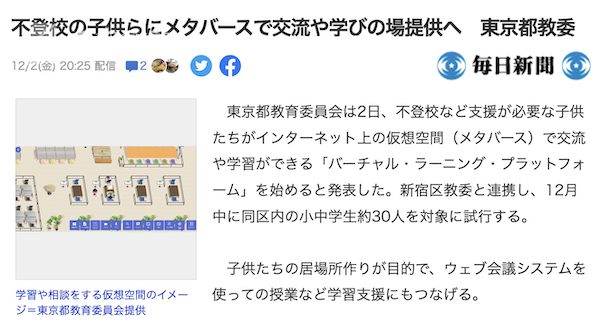 據(jù)《每日新聞》等日媒報(bào)道,東京都教育委員會(huì)12月2日宣布,為了幫助厭學(xué)兒童,將通過元宇宙平臺(tái)幫助他們進(jìn)行日常學(xué)習(xí)和交流。東京都教委將和新宿區(qū)教委合作,在12月以新宿區(qū)大約30名中小學(xué)生為對(duì)象先進(jìn)行試運(yùn)......