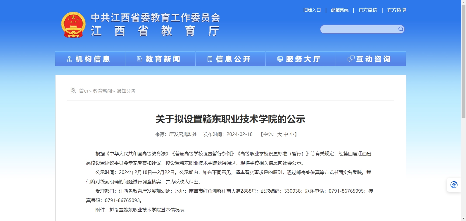 從江西省教育廳獲悉,擬設(shè)置贛東職業(yè)技術(shù)學(xué)院,正在公示中。 以下是公示原文: 根據(jù)《中華人民共和國高等教育法》《普通高等學(xué)校設(shè)置暫行......