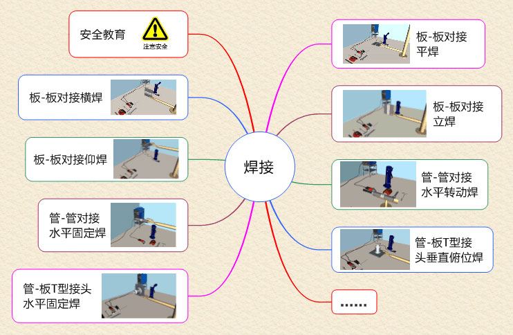 虛擬仿真焊接現(xiàn)場為學(xué)生創(chuàng)造了各種焊接類型的環(huán)境,完整的焊接流程和著重點(diǎn)標(biāo)注,全方位體現(xiàn)焊接操作流程。板對板焊,板對管焊和管對管焊3大類,又細(xì)分平焊,橫焊,立焊,仰焊等幾類細(xì)分。各類工具和工件三維仿真模型清晰直觀的展示在大家面前。
