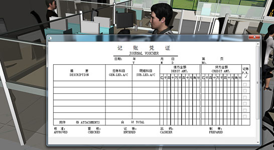 采用三維虛擬實驗室,將企業(yè)中財務(wù)室、車間、銀行等虛擬場景呈現(xiàn)課堂上,師生仿佛身臨其境,可以真實體驗財務(wù)單據(jù)的填寫以及流程的操作。