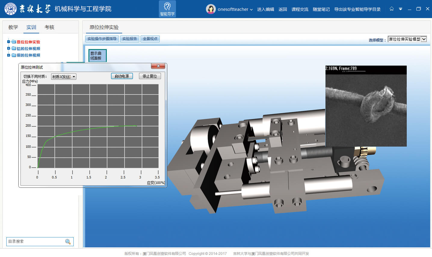 【項目概述】 實驗項目“材料原位拉伸虛擬仿真實驗”,由國家重大科學儀器設備開發(fā)專項:“材料力學性能原位測試儀器與軟件系統(tǒng)的研制開發(fā)(2012YQ03007501)”、國家自然科學基金優(yōu)秀青年基金:“材料微觀力學性能原位測試技術與應用(51422503)”、國家“863”計劃重大項目課題:“跨尺度原位力學測試新技術與儀器裝備的開發(fā)制造(2012AA041206)”、國家自然科學基金項目:“接近服役條件下材料微觀力學性能原位測試新技術的研究(51275198)”等多個國家級科研項目或課題的科研成果轉(zhuǎn)化而來,列為吉林大學開放創(chuàng)新實驗項目,用于大學生科技創(chuàng)新能力訓練。